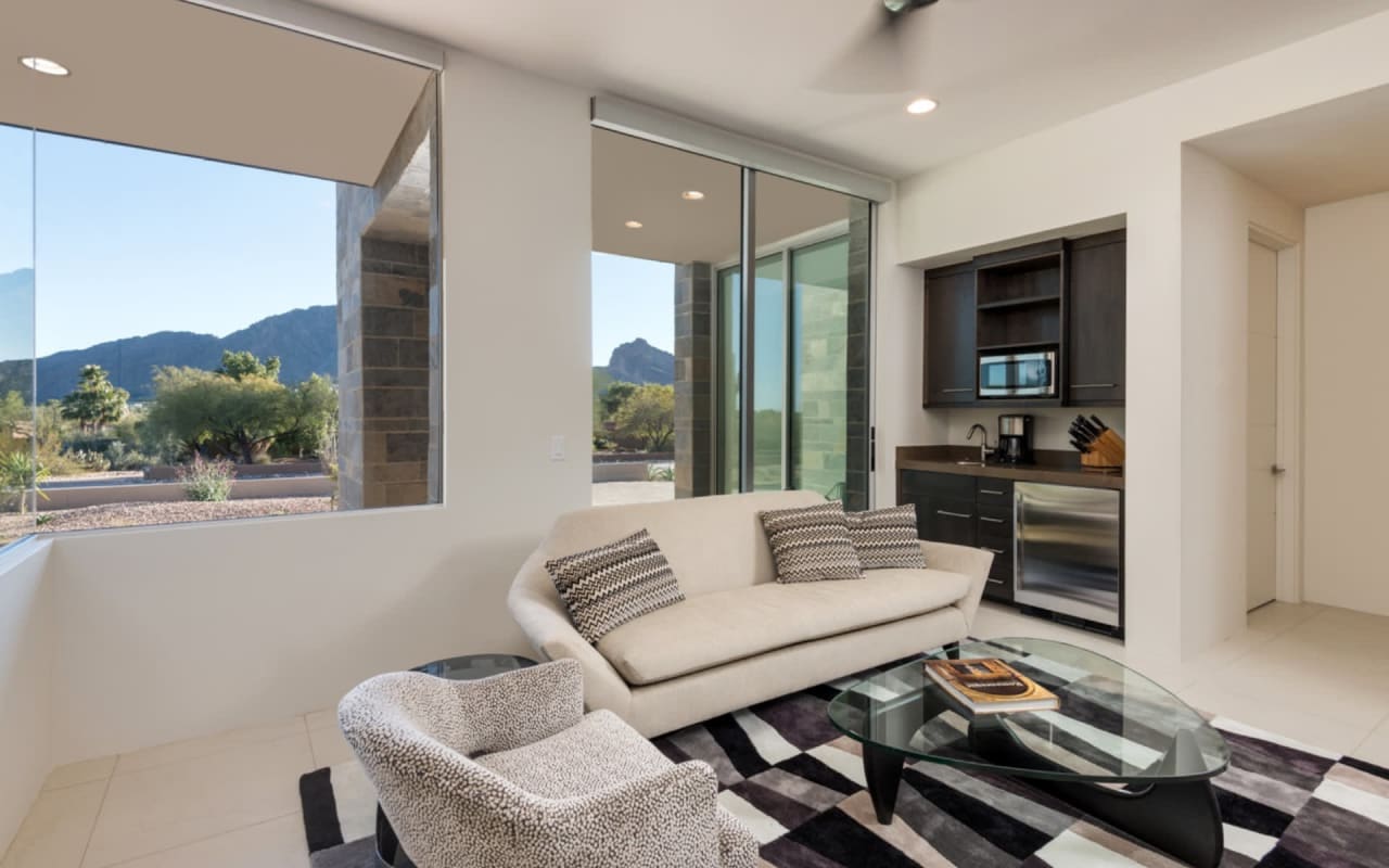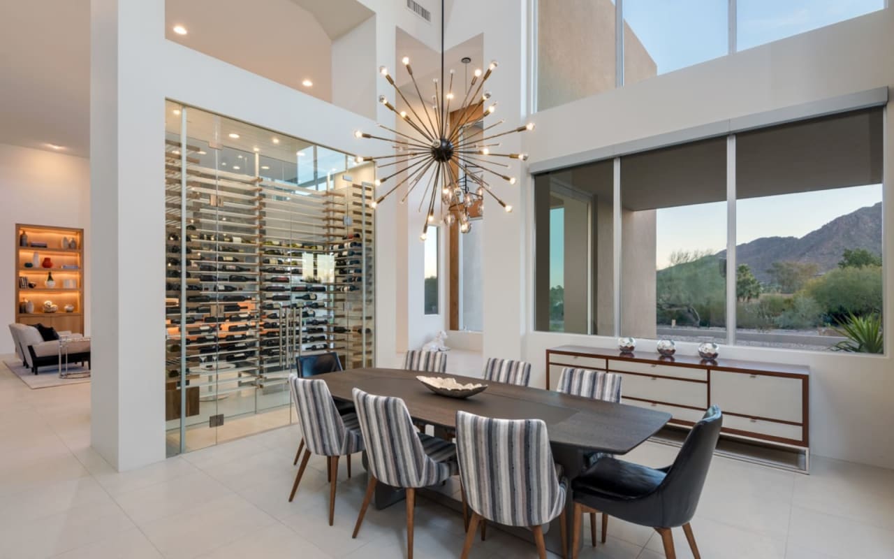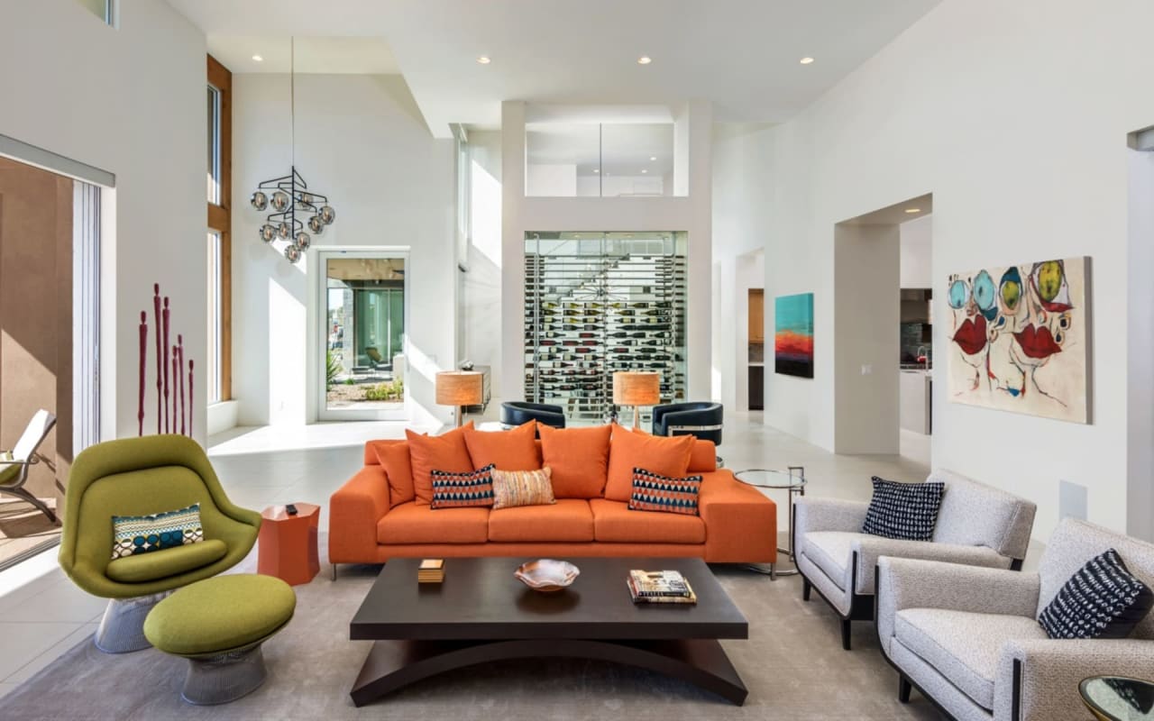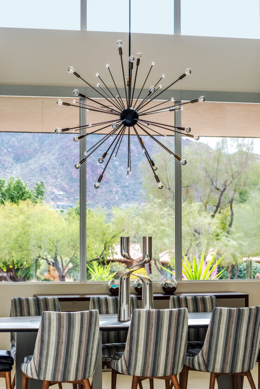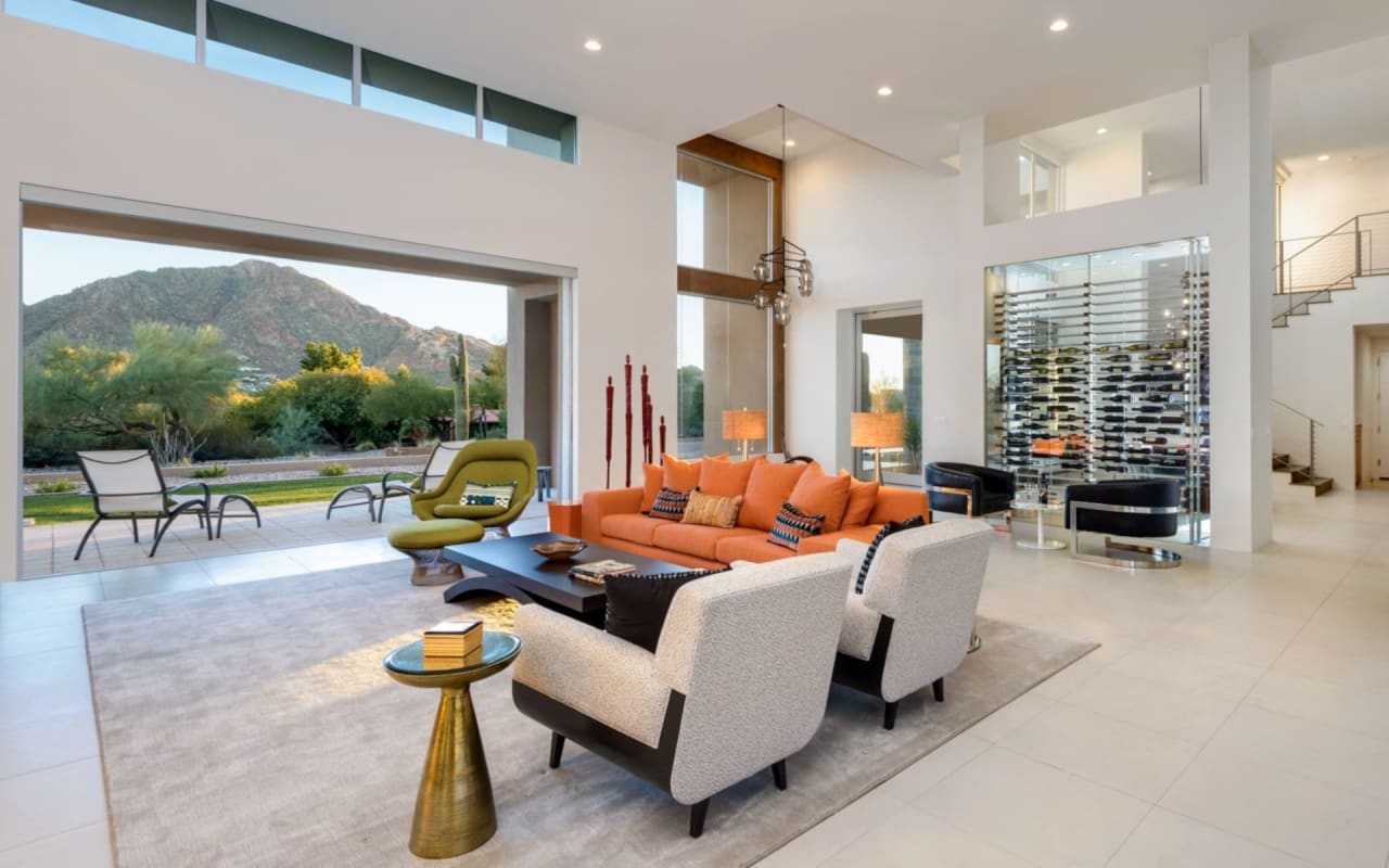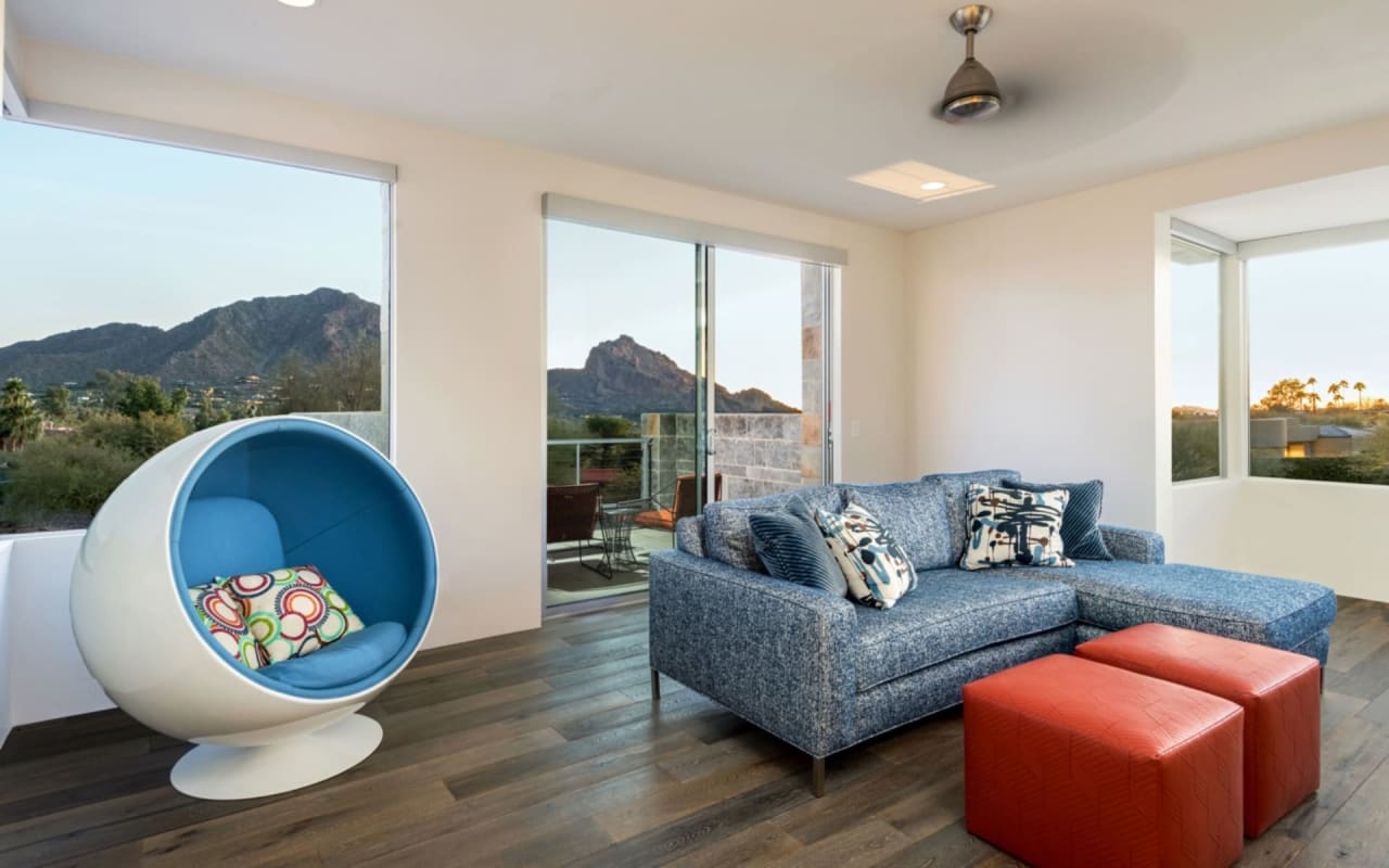 ​​​​​​​The iconic private bridge leading towards the master suite creates an architectural image in itself with the majestic Camelback Mountain backdrop. A re-imagined mid-century modern interior by Est Est gives the home a unique personality. Pops of color and defined lighting throughout enhances the state-of-the-art architecture.