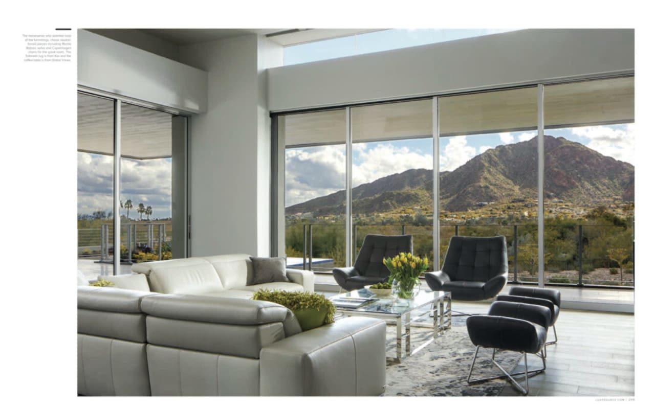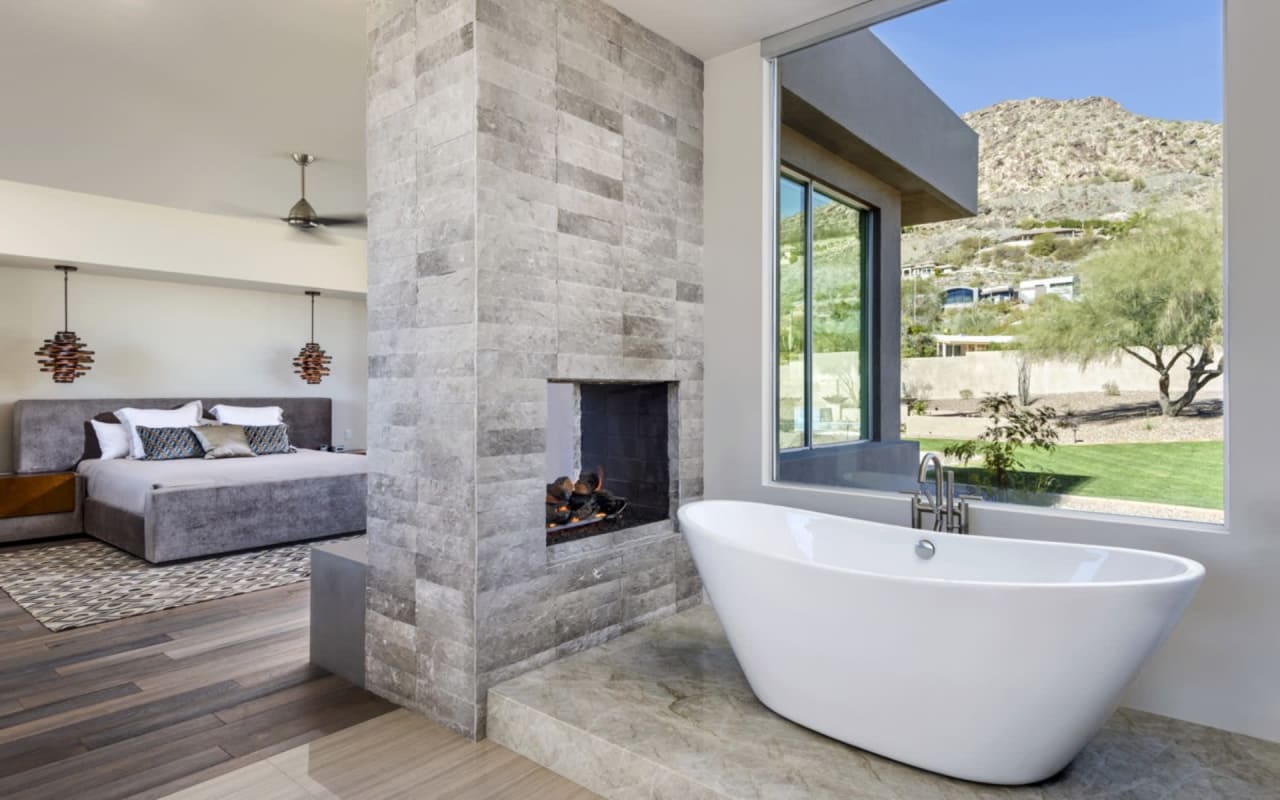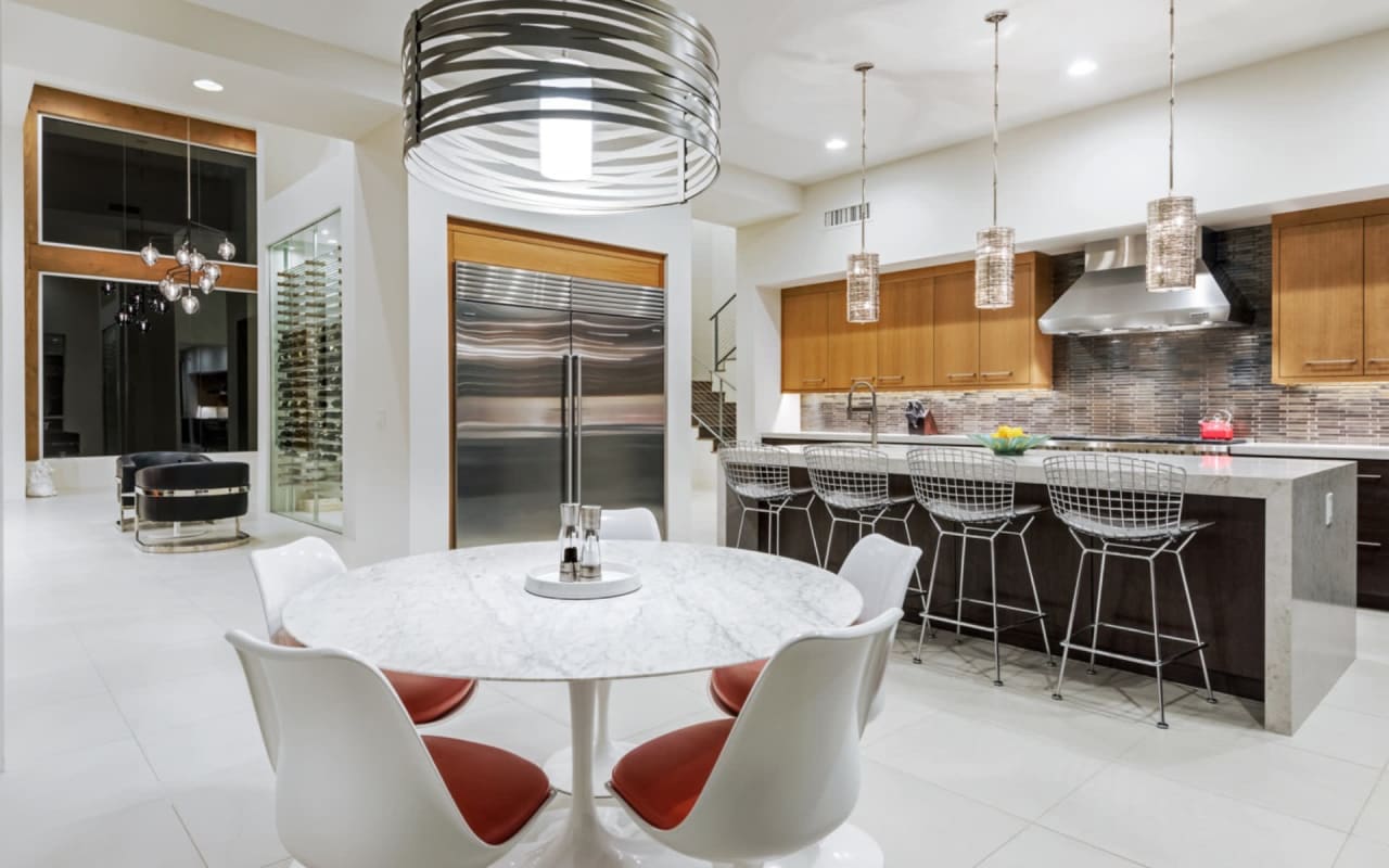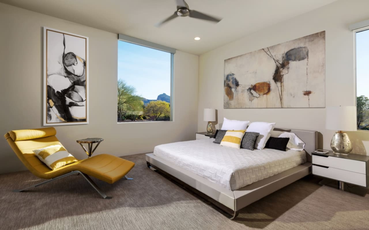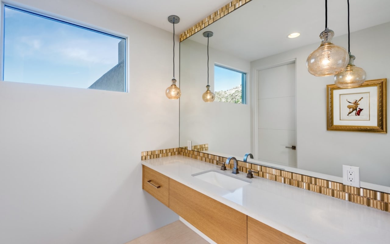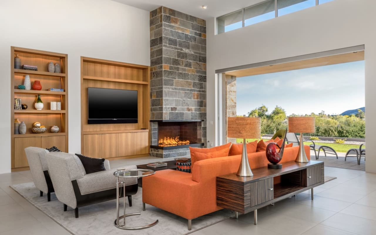 ​​​​​​​The iconic private bridge leading towards the master suite creates an architectural image in itself with the majestic Camelback Mountain backdrop. A re-imagined mid-century modern interior by Est Est gives the home a unique personality. Pops of color and defined lighting throughout enhances the state-of-the-art architecture.