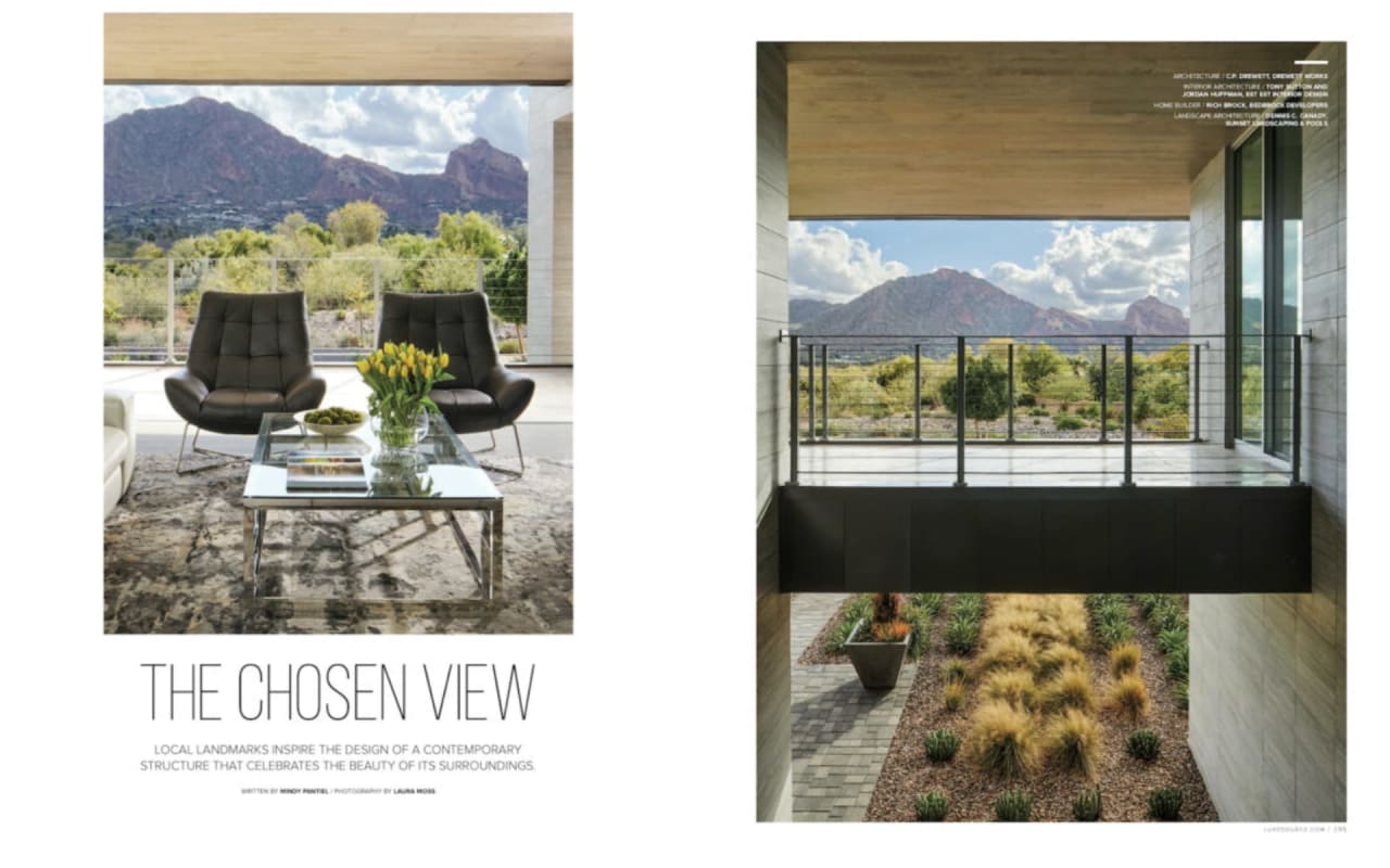 With forward-thinking, modern architecture, the exterior of this nearly 14,000 square feet home intrigues you with elegant stream-lined shapes and materials. Located at the base of Mummy Mountain, this 180-degree view captures the spectacular Camelback Mountain range and distant views of the Phoenix skyline.